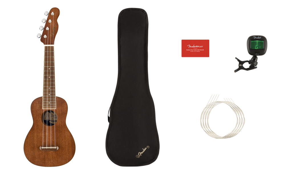A perfect choice for beginners, the Fender Seaside Ukulele Pack has everything you need to begin playing right out of the box. Compact, comfortable and easily portable, this soprano uke is ideal for beginning players or anyone looking to add its light, joyful sound to their music. The Fender Seaside Ukulele Pack comes with a padded gig bag, ukulele strings and a clip-on tuner—everything you need to start playing right away. We’re also including a free 3-month subscription to Fender Play®—the easiest way to learn ukulele.