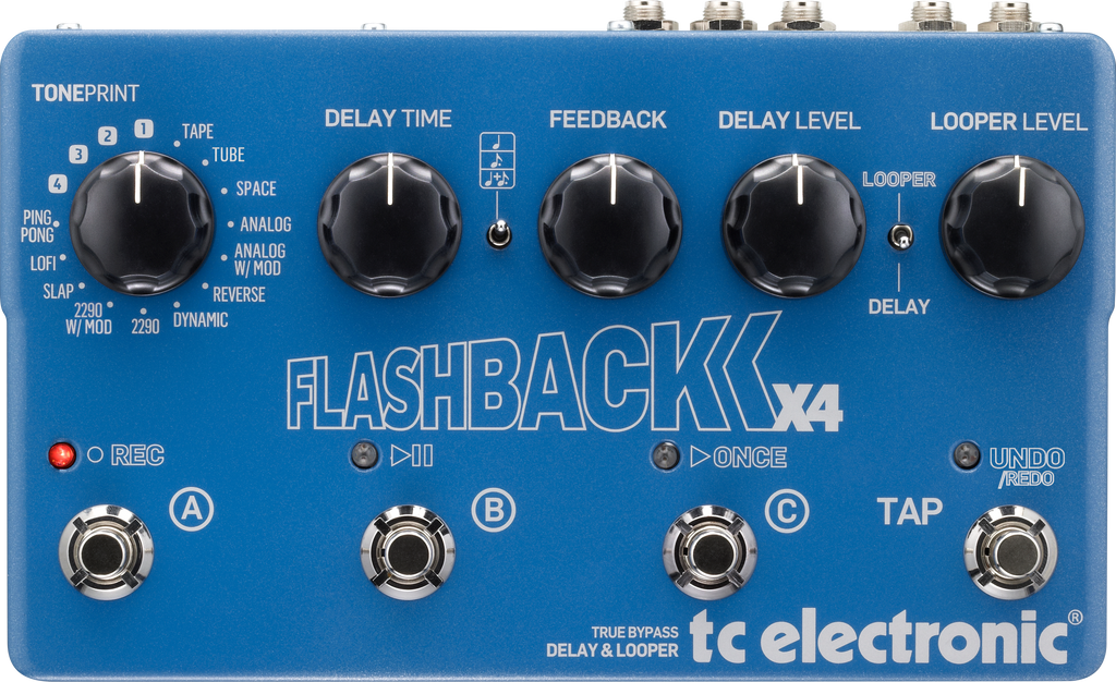 Il TC Electronic Flashback X4 è un versatile delay e looper a pedale con tecnologia TonePrint. Il Flashback Delay X4 è una versione più ampia del modello Flashback compatto e offre 16 tipi di delay, che vanno da eco a nastro e valvolari a delay e reverse delay analogici. Ci sono quattro slot per l'importazione di preset TonePrint forniti da utenti TC Electronic leggendari come Steve Morse. Il Flashback X4 ha 4 interruttori a pedale, tre dei quali possono essere utilizzati per selezionare i preset e uno è per il tap-tempo. Senza complicati menu, i controlli del Flashback X4 sono tutti switch e manopole. Ci sono controlli per Delay Time, Feedback, Delay Level e Level Looper. C'è un interruttore per attivare un looper da 40 secondi e la possibilità di usare gli interruttori a pedale come controlli Record, Play / Pausa, Play Once e Undo. Sul retro dell'unità, ci sono opzioni per il collegamento MIDI, USB di un pedale di espressione, così come Input e Output stereo.