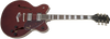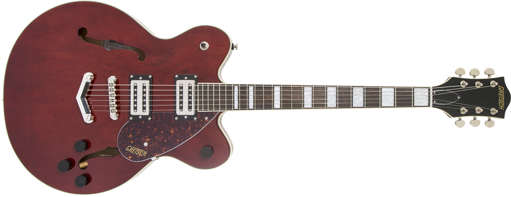 Revitalizing the best elements from the past, the G2622 Streamliner™ Center Block Double-Cut with V-Stoptail bursts into the modern music era with powerful sound and style. Brash and feedback-resistant, the sleek G2622 is designed for the guitarist who demands more than the mundane from an instrument—more performance, more style and most importantly, more volume—while retaining all you expect from a Gretsch. The secret to the Streamliner’s sound is twofold—the Broad’Tron™ BT-2S humbucking pickup and the spruce center block. Designed specifically for the Streamliner Collection, the high-output Broad’Tron pickup spawns improved definition with tighter bass response for robust lows, pristine highs and a throaty midrange. A lightweight spruce center block runs the length of the body, reinforcing the top while eliminating undesired feedback for volume-friendly performance on rocking stages. The Streamliner’s sonic power is harnessed and shaped by the traditional control layout—neck and bridge pickup volume controls, a master tone control, master volume control and three-way pickup switching. A fast-playing 12”-radius laurel fingerboard with elegant pearloid Big Block inlays and 22 medium jumbo frets sits atop the white-bound neck with a thin “U”-shaped profile—ideal for chord work or fiery riffing. Enjoy rock-solid tuning stability courtesy of the stylish Gretsch V-Stoptail tailpiece, anchored Adjusto-Matic™ bridge and synthetic bone nut. All the classic eye-catching style you’ve come to expect from Gretsch is here—vintage-style black control knobs, enlarged F-holes for increased acoustic projection, elegant aged white binding with upgraded purfling, slick-looking nickel hardware, three-ply tortoise pickguard and arched laminated maple construction. Nearly impossible to put down once you pick it up and start playing, the G2622 has the updated sound and classic style that has earned Gretsch accolades since the dawn of rock ‘n’ roll. Available in Phantom Metallic, Single Barrel Stain and Walnut Stain.