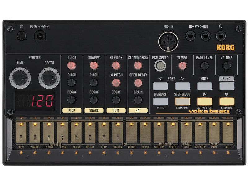 Le batterie elettroniche analogiche hanno il potere di emergere dagli arrangiamenti, e sono spesso indispensabili nelle performance live e nella produzione di musica elettronica. Il Korg Volca Beats offre 6 dei suoni che rispecchiano il classico stile analogico: cassa, rullante, 2 tom, open e close hi-hat. Volca Beats riduce all'essenziale i parametri di editing per creare velocemente il sound che desideri. Ad esempio, utilizzando i tre parametri Click, Pitch e Decay potrai dar vita ad un'incredibile varietà di suoni di cassa, dai più grezzi e cattivi ai più asciutti per i beat più precisi. La sezione PCM consente di coprire sonorità come clap, clave, agogo e crash con una wavetable a tema, con suoni lo-fi in stile '80 che si adattano alla perfezione con la sezione analogica. Il Volca Beats include anche un sequencer Electribe-style per un facile inserimento di pattern ritmici. È possibile utilizzare ognuno dei 16 tasti/step per voce per l'inserimento delle note quando il sequencer è in esecuzione, ottenendo un feedback visivo del LED all'interno delle battute. C'è anche una funzione Stutter per simulare rullate ed effetti di delay. Anche i movimenti del potenziometro Stutter sono registrabili all'interno della sequenza. Dispone di connessioni MIDI IN e mini jack sync in e out per l'utilizzo in catena, sincronizzato ad altri synth analogici, per l'utilizzo tramite una DAW, o con tastiere MIDI esterne.