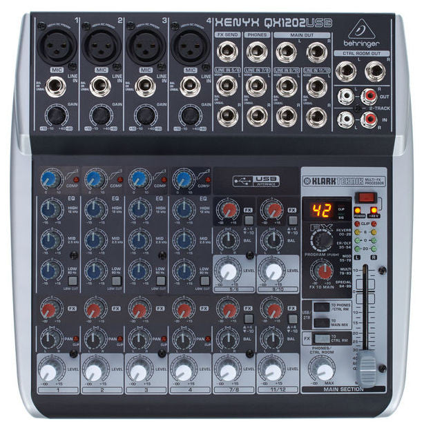 Mixer analogico a 12 ingressi e 2 bus con compressori e preamplificatori di microfono XENYX , equalizzatori "British" compressori inclusi. Multi-FX KLARK TEKNIK. Interfaccia USB/Audio e software di produzione. 4 preamplificatori di microfono con Phantom. Uscite mixer principale jack di 2,5 mm, uscite di registrazione stereo, auricolari. Sorgente di alimentazione esterna.