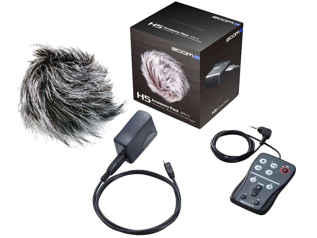 Pack di accessori per lo Zoom H5 composto dal telecomando con cavo RCH-5, alimentatore USB AD-17 più filtro antivento.