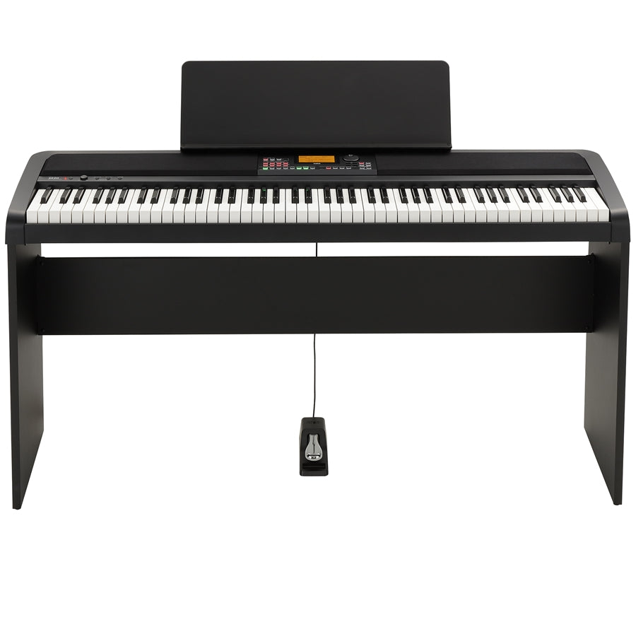 Elegante design in grado di adattarsi a qualsiasi ambiente XE20 è profondo solo 34 cm e pesa solo 11,4 kg (* senza leggio e supporto opzionale). La razionale disposizione dei comandi principali sul pannello frontale, gli conferisce l’aspetto tipico del pianoforte digitale, mentre la sua linea sottile ed elegante consente di inserirlo adeguatamente in ogni ambiente ed arredamento; può essere posizionato a piacere, o a seconda delle esigenze: su un tavolo, una scrivania, un supporto standard da tastiera, oppure sull’apposito supporto dedicato (opzionale), dall’impatto estetico globale molto efficace. Sistema di amplificazione potente e dinamico Il sistema di amplificazione interna di XE20 è stato progettato per fornire il massimo in termini di qualità, potenza e chiarezza nella riproduzione. Molta cura è stata riposta nella taratura del suo balance generale, in modo da valorizzare al massimo i suoni più tipici degli Style, come basso e batteria, e nello stesso tempo far risaltare i suoni di pianoforte. Tastiera con il tocco di un pianoforte acustico Questo strumento utilizza una tastiera pesata 88 tasti che riproduce realisticamente il tocco di un pianoforte a coda, compresa la sensazione tattile generata dalla differenza di peso dei martelli tra il registro grave e quello acuto. Questa dispone inoltre di grande sensibilità e di un raffinato bilanciamento che consente di ottenere senza sforzo un’ampia gamma dinamica. Risulta particolarmente adatta inoltre, anche per lo studio specifico del pianoforte, mentre la sua estensione favorisce inoltre l’esecuzione di brani per pianoforte a 4 mani, o divertenti duetti con amici o familiari. Ampia varietà di software in Bundle per studiare e sviluppare la creatività musicale. XE20 viene fornito di un’ampia dotazione di Software, in grado di far evolvere rapidamente le conoscenze e le abilità personali in campo musicale. Skoove un programma didattico in grado di migliorare la capacità d’esecuzione sulla tastiera.